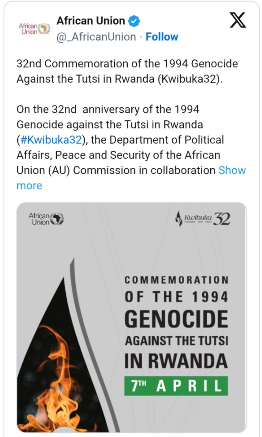Umuryango wa Afurika Yunze Ubumwe AU, ubinyujije ku mbuga nkoranyambaga zayo watangaje ko uzifatanya n’Abanyarwanda ndetse n’Isi yose muri ibi bihe byo Kwibuka ku nshuro ya 32 Jenoside yakorewe Abatutsi.